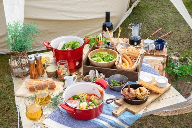 湘南近郊で採れた彩り豊かな食材のアペタイザーから始まり、薬膳や厳選した食材を用いて身体を温める3種(魚・牛肉・豚肉)のシェフ特製のホットポットへと続く。デザートは食感と温度差を楽しむアップルパイでアウトドア気分を満喫できる。