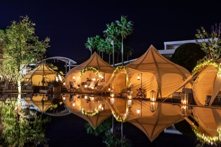 2020年11月4日にオープンしたグランピングレストラン「MALIBU FARM カマクラテラス」は、「MALIBU FARM 逗子マリーナ」の三方を水に包まれたウォーターテラスの一角に配置。ヤシ並木と海を背景に、水盤に映るフォトジェニックなテントが印象的。夕暮れになると明かりをともしたテントが浮かび上がり、ナイトグランピングのような幻想的な空間が広がる。