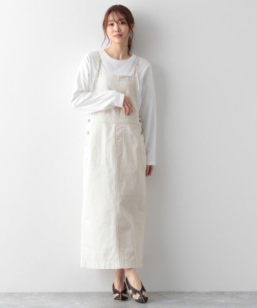 細身シルエットのジャンパースカートなら、大人女性が着ても子供っぽくなりません。