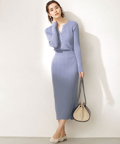 トップスもスカートも細身でコンパクトなサイズ感なので、明るい色のセットアップもきれいめに着こなせます。