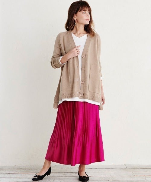 細プリーツスカートは、明るい色でも上品な印象。