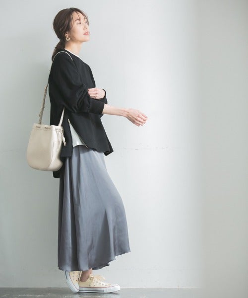 サテン素材のプリーツスカートが上品なので、カジュアルすぎなくていいですね。