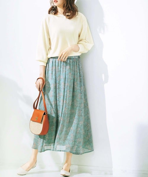 グリーンの花柄スカートは春感満載のコーディネートを作ってくれます。