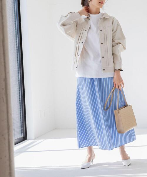 ブルーストライプのスカートで春らしいさわやかな着こなしを。