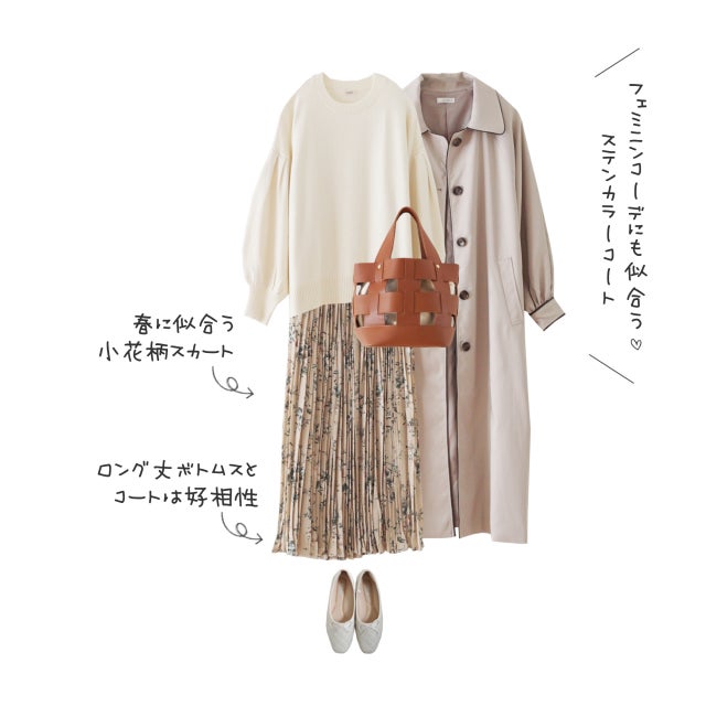 白のニットに小花柄スカートを合わせたフェミニンコーデ。ステンカラーコートは、スカートと丈が大体同じくらいで好相性。ふんわりとした袖が女性らしく、フェミニンな着こなしにも似合います。