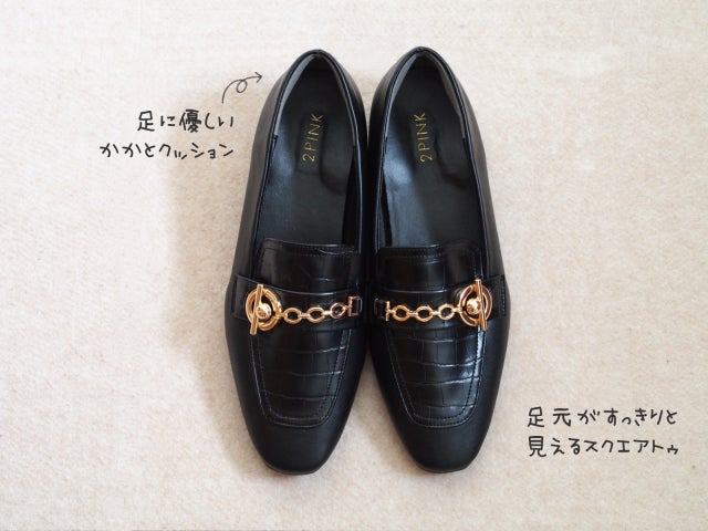 かかと部分はふかふかのクッション付きで、履き心地も快適。つま先はスクエアトゥデザインで、足元がすっきりとして見えます。