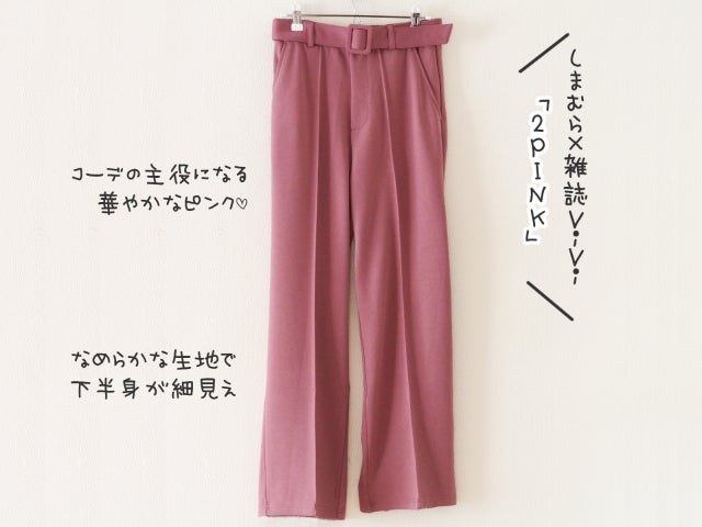 パンツは華やかなピンク色で、コーデの主役になるアイテム。なめらかなジャージー素材が、下半身をきれいに見せてくれます。