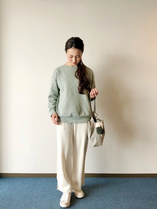 明るい色のGUスウェットトップスは季節を先取りしたようなコーディネートを作ってくれるのでおすすめです。