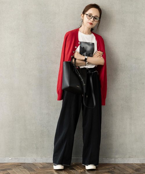赤カーディガン×黒ワイドパンツ