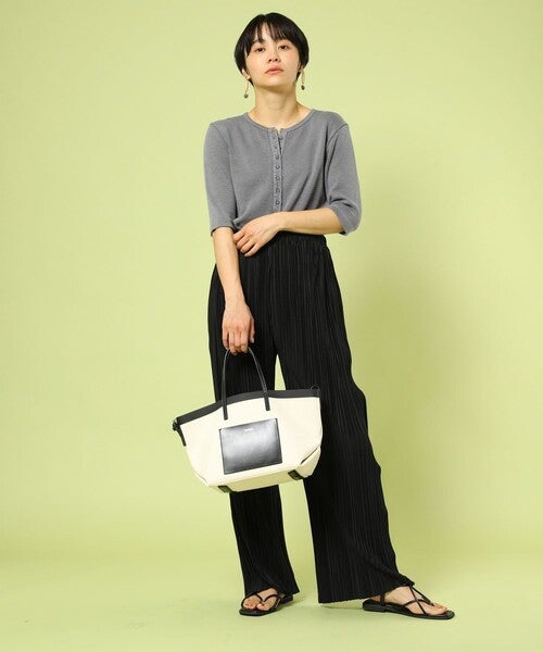 とろみ感が女性らしい黒ワイドパンツは、明るいグリーンのバッグで春らしさをプラス。