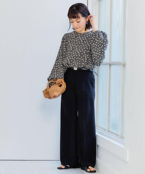 花柄ブラウスはワイドパンツと同色の黒を選ぶと甘くなり過ぎず、フェミニンが苦手な大人女性でも自然に楽しめます。