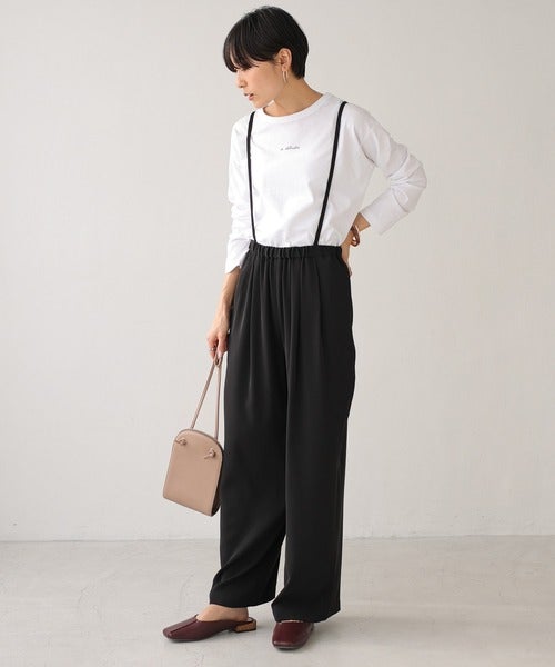 ちょっぴりお茶目なサス付き黒パンツで、春のシンプルなワンツーに自分らしさを上乗せして。
