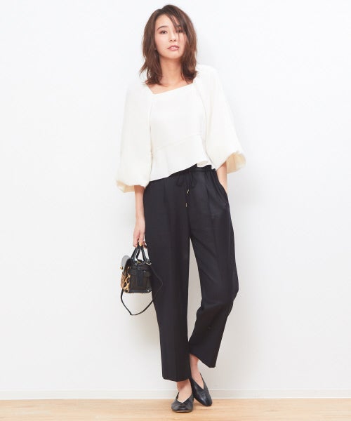ふんわりと丸みのあるボリューム袖が愛らしいトップスを、黒のワイドパンツでハンサム仕上げに♡