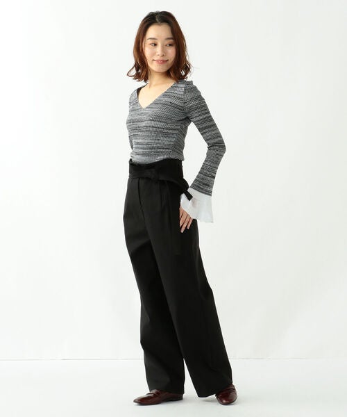 ウエストフリルの黒ワイドパンツなら、春に欲しいガーリーさもさりげなくプラスできますよ。
