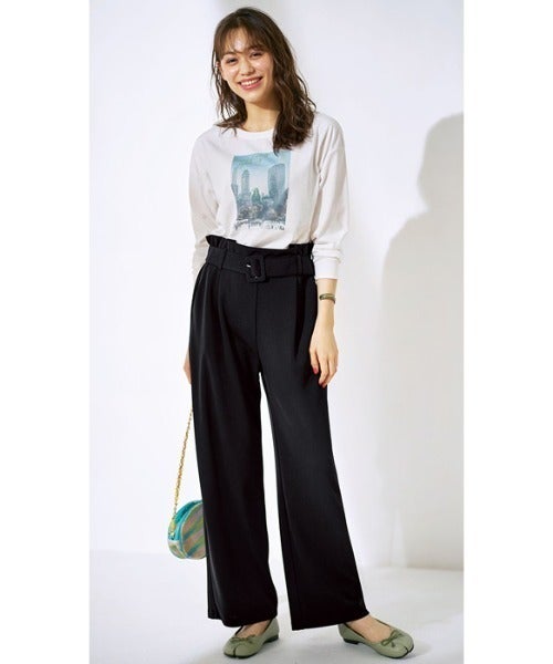 フォトプリントの攻めた遊び心を、黒のワイドパンツが綺麗に受け止めてくれます。