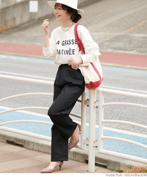 ロンTに黒のベイカーワイドパンツを組み合わせて、とびきりラフな着こなしに。