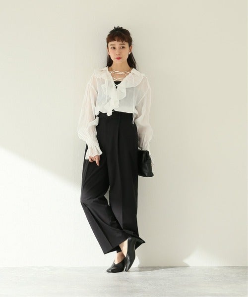 それだけで春らしい可愛さを演出できるフリルブラウスは、黒ワイドパンツとなら大人っぽく洗練された印象に。