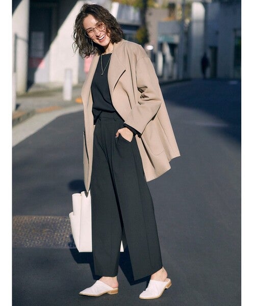 すとんと落ち感のきれいなストレートの黒ワイドパンツに、ベージュ系オーバージャケットをオン。