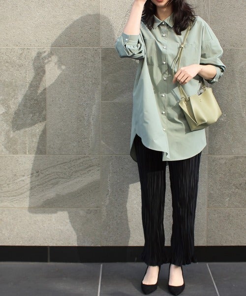 グリーンシャツ×黒ワイドパンツ