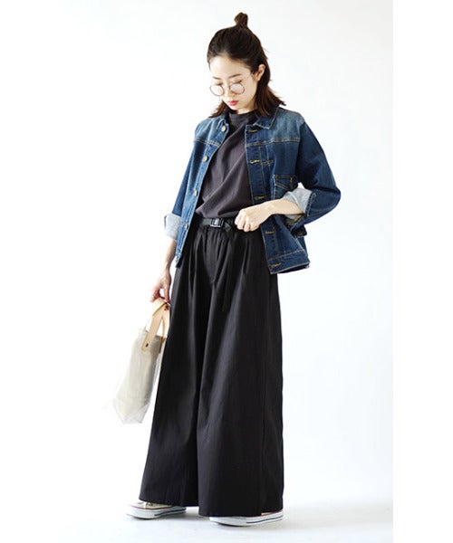 モードな雰囲気の黒ワイドパンツには、デニムジャケットのようなカジュアルなアウターもお似合い。