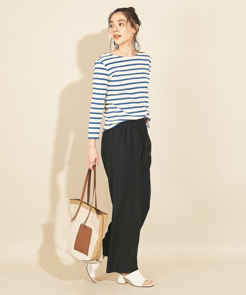 ボーダートップスと黒ワイドパンツで作る、春定番のレディースカジュアルコーデ。