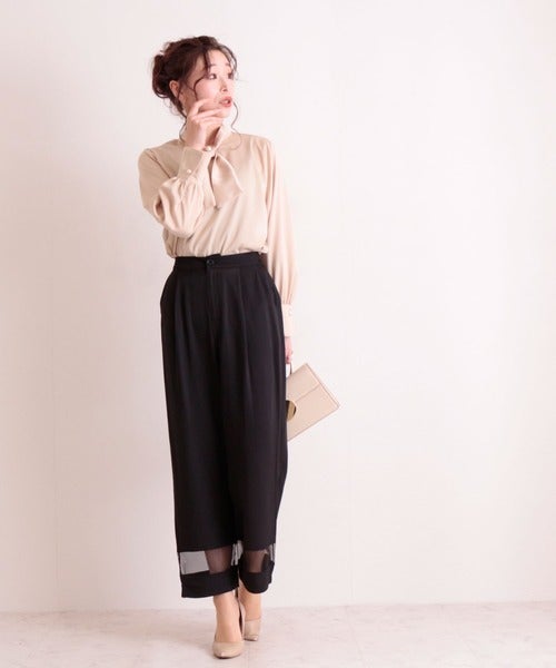 ベージュブラウス×黒ワイドパンツ