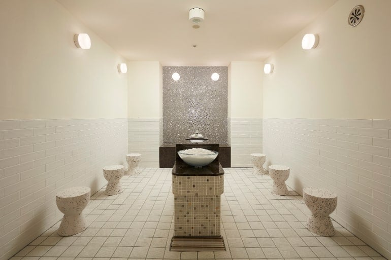「塩サウナ」は、体に塩をのせるようにして塗ること数分、温度50℃、湿度100%の室内で塩が徐々に溶けていき、皮膚表面の老廃物が溶かし出されていき、美肌への近道として近年大人気。