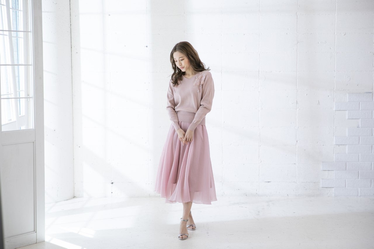 顔回りが一気に華やぐ刺繍とビジューが目を引く大人気のお上品ニットは、同色系のエアリースカートを合わせてトレンドライクにアップデートしたスタイリングがおすすめです。
