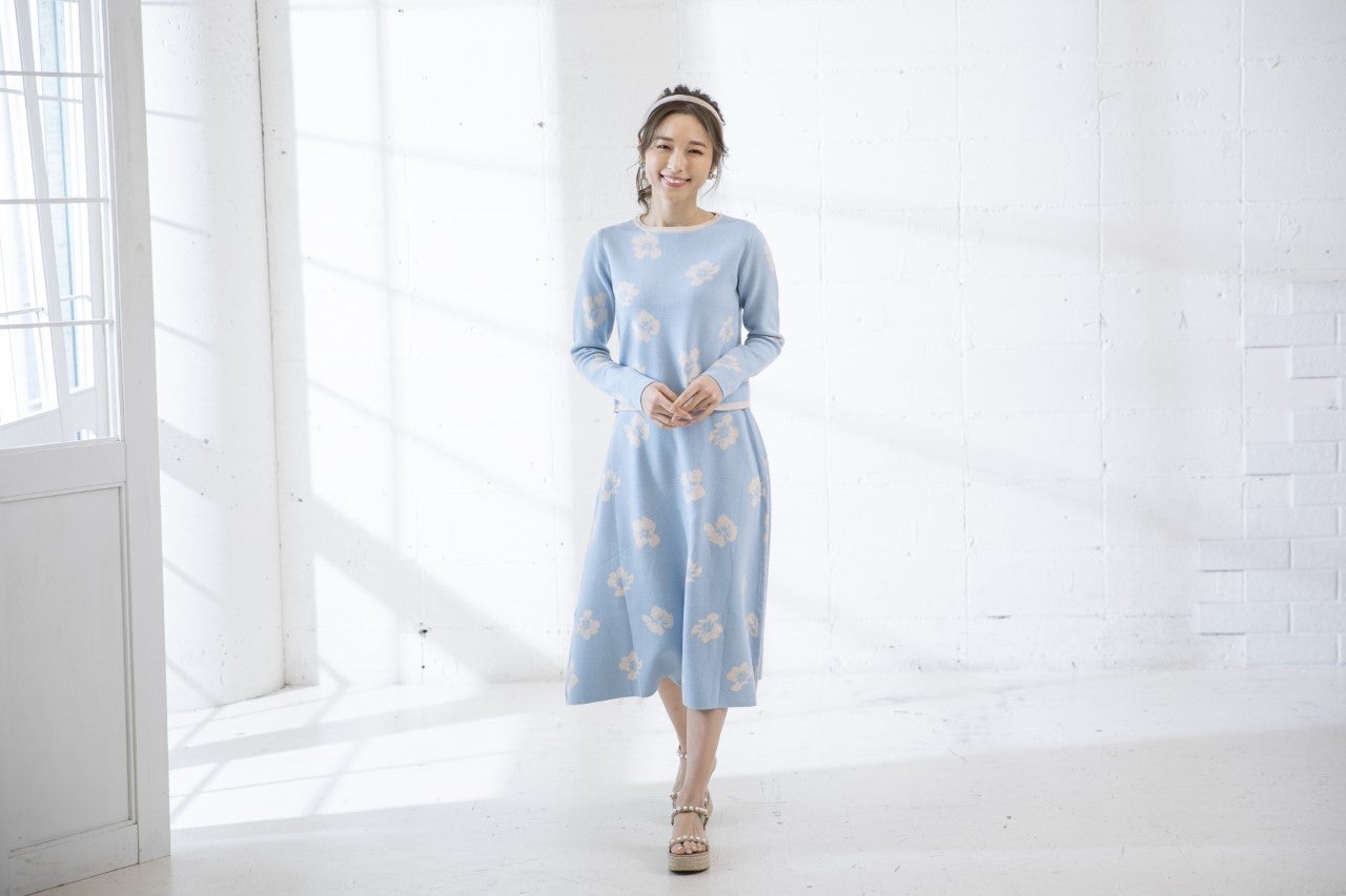 オリジナルのフラワージャガードニットとスカートはセットアップで着られます。