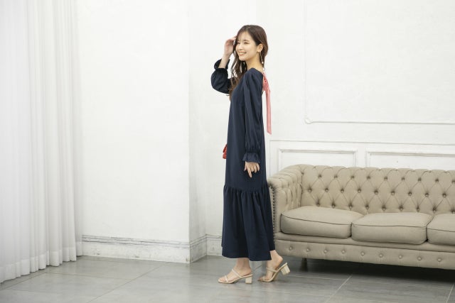 ティアード部分は、スタイルアップできる切り替え位置にこだわり、適度なボリュームをもたせつつ、女性らしく程よい分量に調整されています。