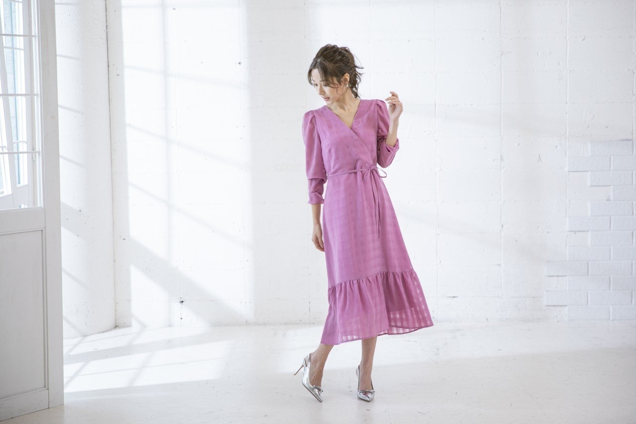 「肩の切り替えが脇から真上に伸び、かっちりしているデザインがストレートさんに似合いやすいワンピースです。また、カシュクールデザインで胸元深めVネックラインがストレートさんの魅力を引き出します。」
