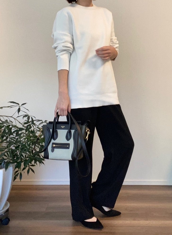 キレイめのストレートブラックパンツを合わせれば、通勤などのONスタイルにもぴったり!