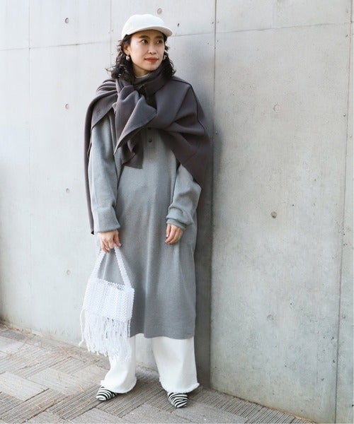 グレー寄りブラウンのポンチョとグレーワンピの濃淡に、クリアな白を聞かせて洗練度アップを狙って。