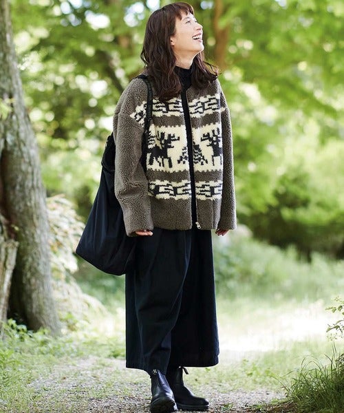 カジュアル度高めなボアカウチンですが、服装を黒茶でそろえることでシックなムードに。