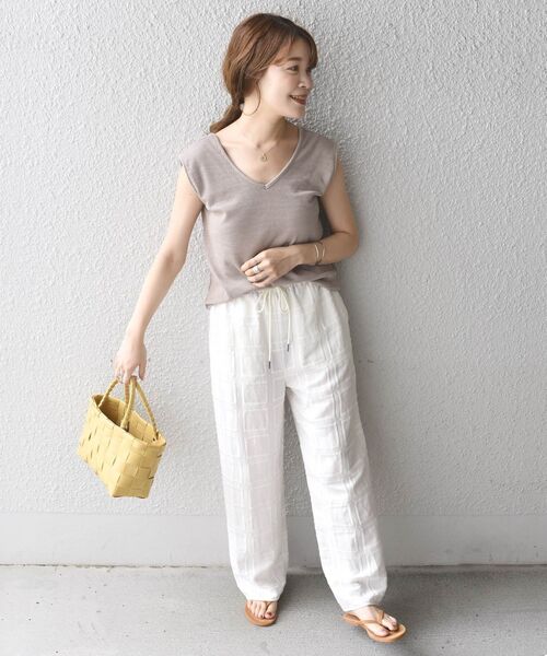 ドライタッチな白パンツやビーチサンダル、かごバッグを合わせて、トータルで気分の上がるファッションに。