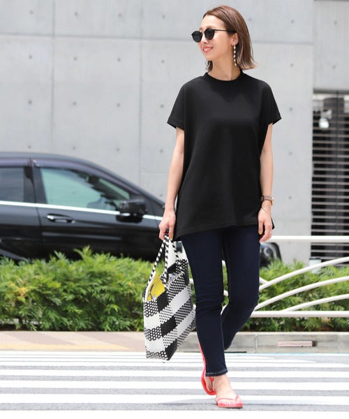 夏の公園デートでは、Tシャツ×スキニーの定番ファッションもおすすめ。全体を黒でまとめたコーデにすることで、大人女性の着こなしに綺麗に馴染みますよ。