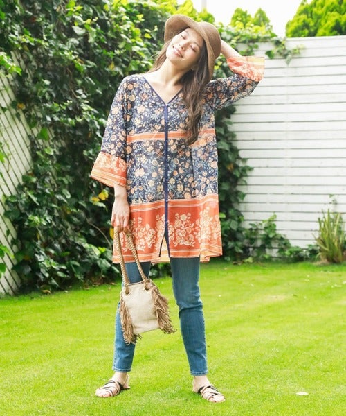 ボヘミアン柄チュニック×デニムパンツ