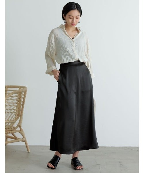 スキッパーシャツブラウスでVネックを強調させて、大人のかっこよさをグッと高めたら、ハリのあるロングスカートでモダンな雰囲気をさらに強調させましょう。