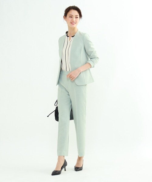 また、ジャケットなどビシッとしたクールなアイテムも似合うので、春色の爽やかなライトグリーンのジャケットと、インナーには縦のラインがデザインされたブラウスを合わせたコーデがおすすめ。