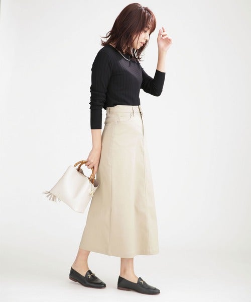 顔タイプ「クール」に似合うVネックをトップスに、ボトムスはIラインスカートでレディな印象も引き立てる春ファッションに。