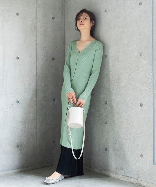 スタイリッシュでモダンなファッションが似合う顔タイプ「クール」の春コーデには、タイトなニットワンピースを春色で決めた大人度高めの装いはいかがでしょうか。