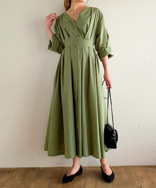 大人グリーンのこちらのワンピースは、顔タイプ「クール」さんに似合う春コーデへと導いてくれますよ。