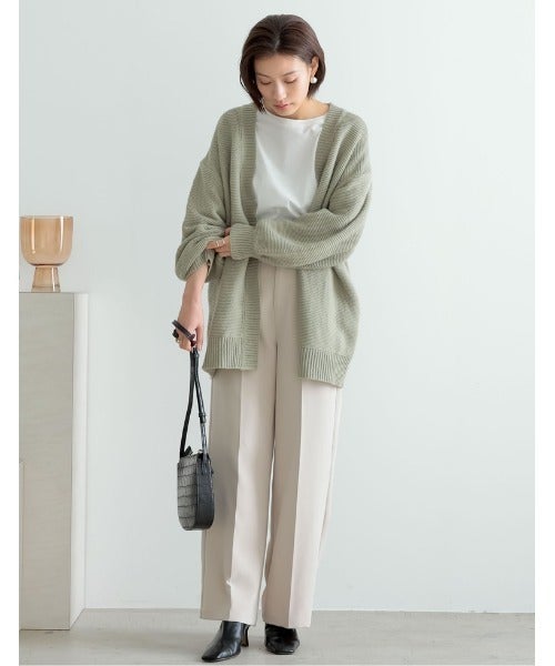 顔タイプ「クール」の大人女性がゆったりとしたニットカーデを春ファッションに取り入れるなら、他のアイテムで直線を意識させる着こなしに導くといいですよ。