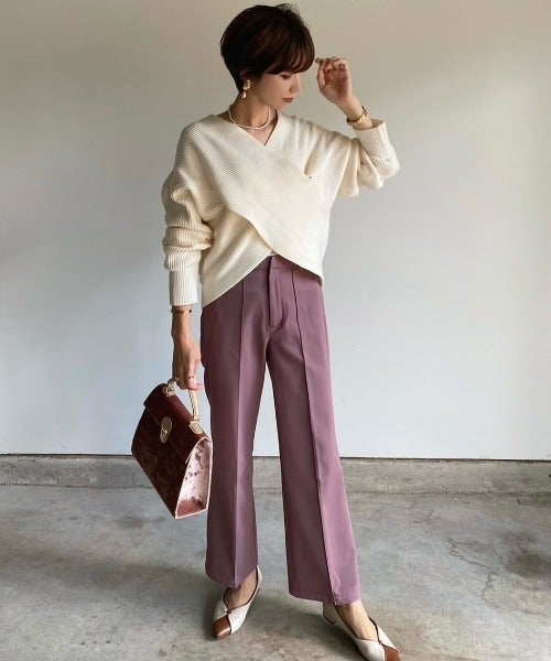 とくに骨格ウェーブの顔タイプ「クール」さんは、Xラインを意識した春コーデで体のラインを美しく見せたいので、画像のようなフロントカシュクールのトップスを取り入れると素敵に決まりますよ。