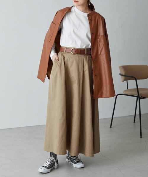 メンズ感のあるチノ素材をスカートに、さらにクールなレザージャケットをサッと肩がけにしましょう。トップスは白で春感を演出すれば、垢抜けた春コーデに仕上がります。