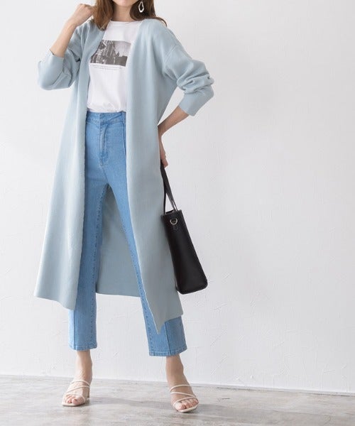 ブルーのデニムを引き立てるためにトップスは白の無地をチョイス。縦の線をアピールするロングカーデをサッと着こなして、クールな大人の春に似合うファッションに仕上げましょう。