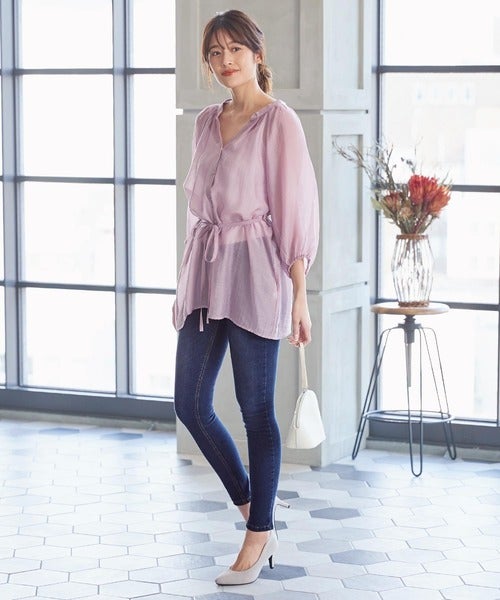 せっかくの春ですから、顔タイプ「クール」の女性にも似合う大人ピンクのブラウスと、濃いめブルーのスキニーデニムを合わせましょう。