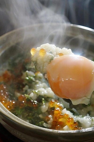 ポイントは七草粥のトッピングに使ったイクラの醤油漬け&温卵♪