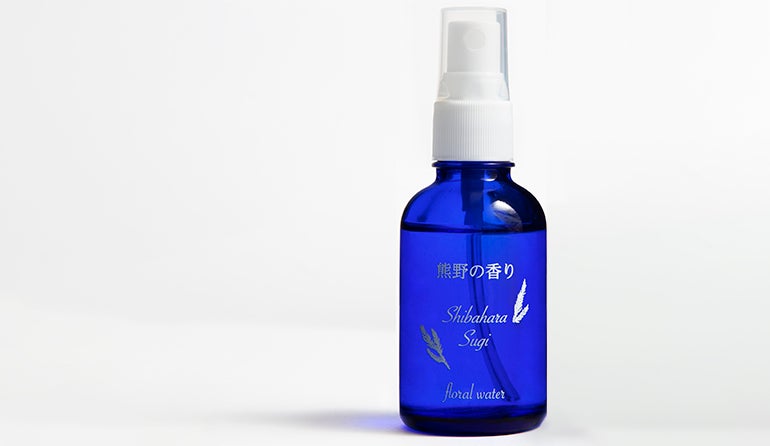 フローラルウォーターはエッセンシャルオイル抽出時にとれる香り成分がとけこんだ蒸留水(芳香蒸留水)のことで、エッセンシャルオイルに比べ刺激が少なく、香りも穏やかなのが特徴。「熊野の香り」は、このフローラルウォーター100%でできている。
