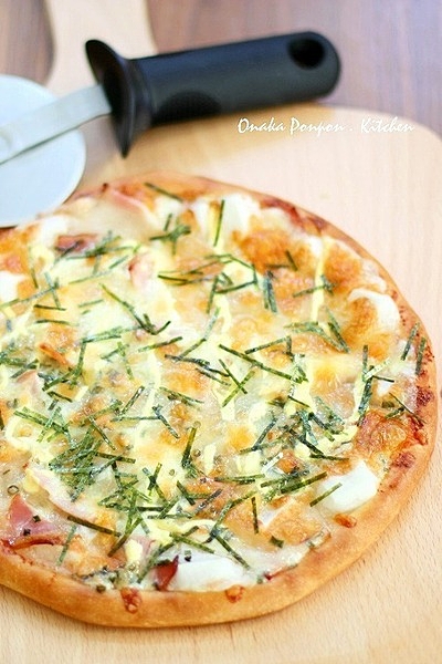 3. パスタソースを塗り、ネギをのせます。再びふんわりラップをかけ、レンジで1分ほど加熱したら出来上がりです。(カリカリにしたい場合はトースターでも可)